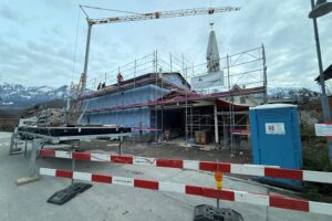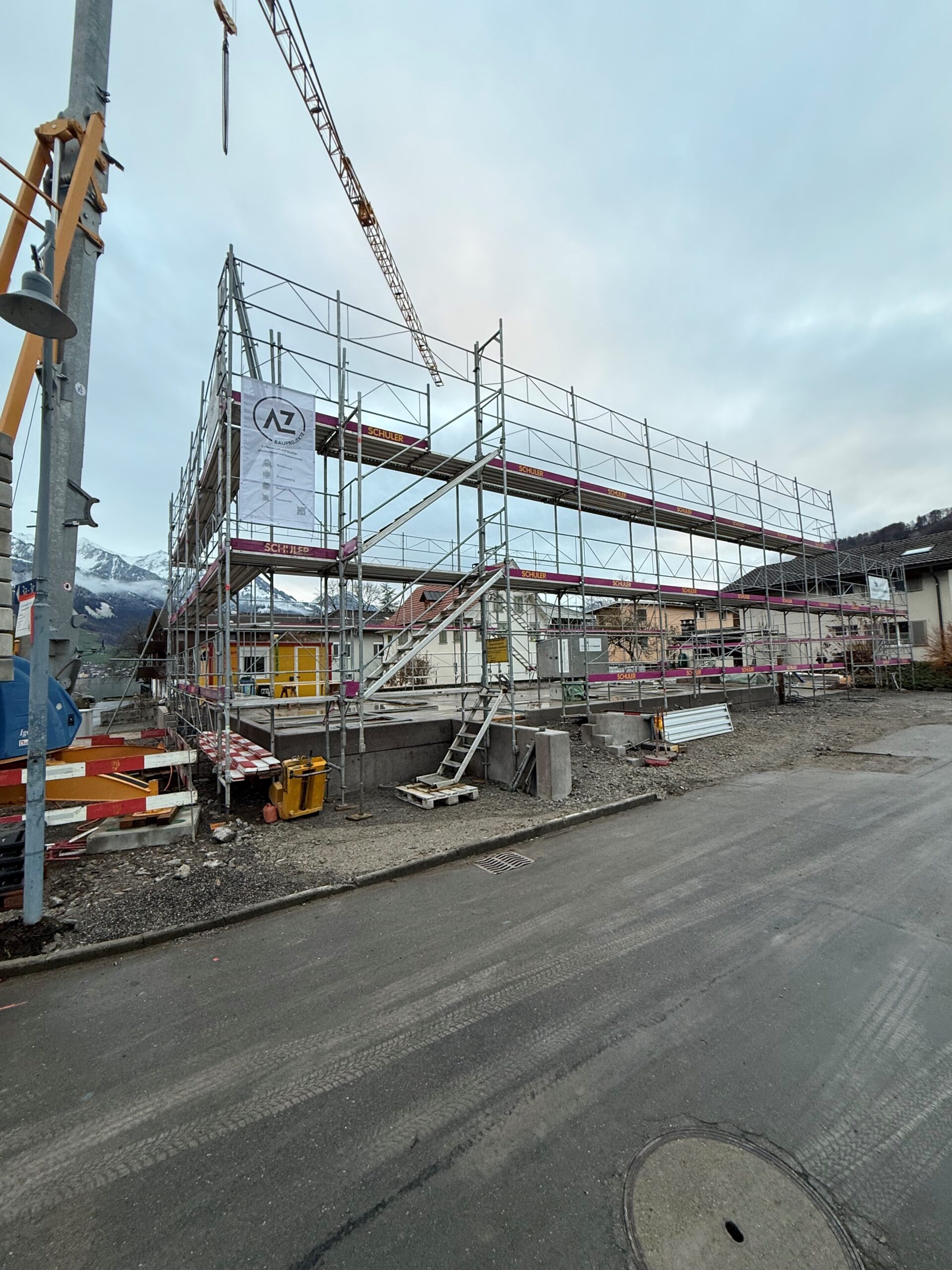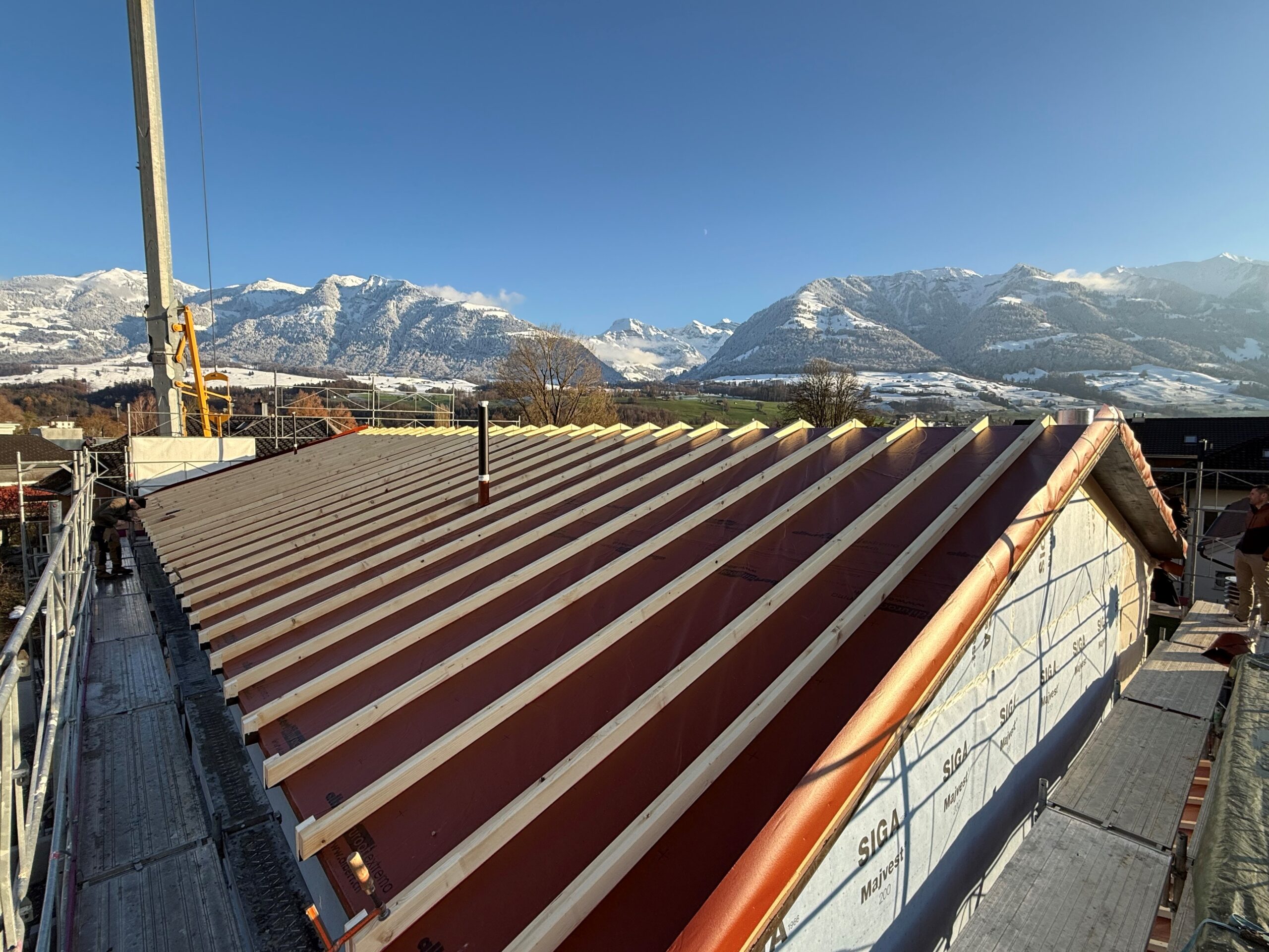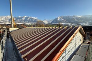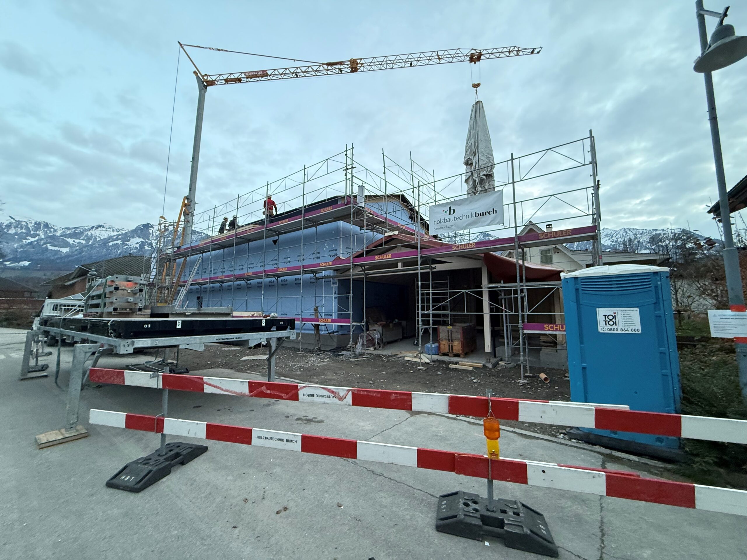 Auf unserer Baustelle in Sarnen ist der Holzbau nun aufgerichtet. Die Wände und das Dach stehen, und man erkennt bereits gut, wie sich das Haus später ins Grundstück einfügt.