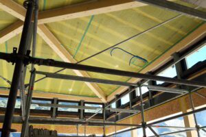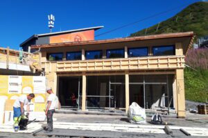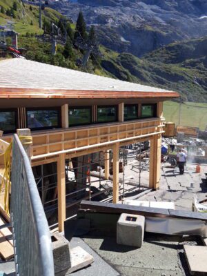 Die Bauarbeiten am Berghotel Trübsee schreiten sichtbar voran. Die Tragkonstruktion aus Holz steht bereits, Dach und Fenster sind montiert und mit Wärmedämmung versehen. Parallel laufen die Arbeiten an der Fassade, während im Inneren die Vorbereitungen für den Ausbau beginnen.
