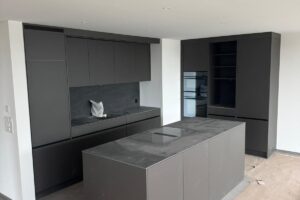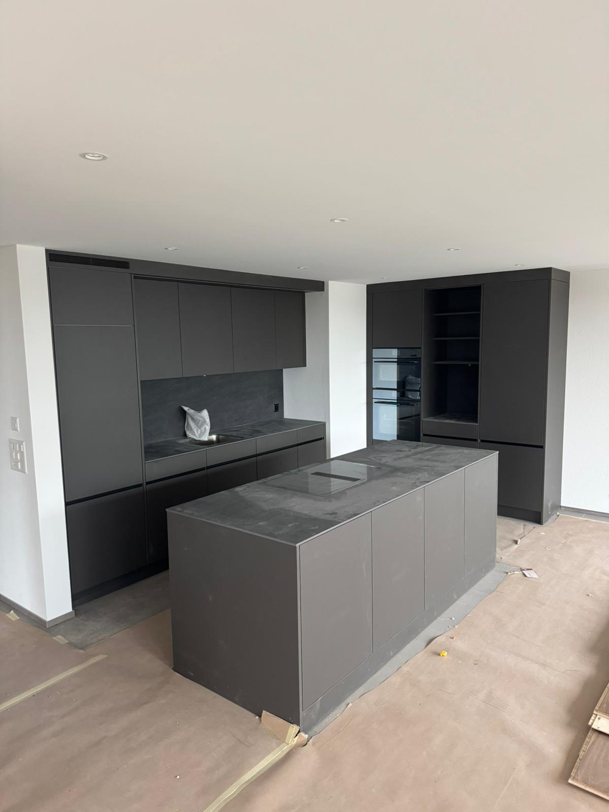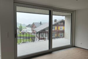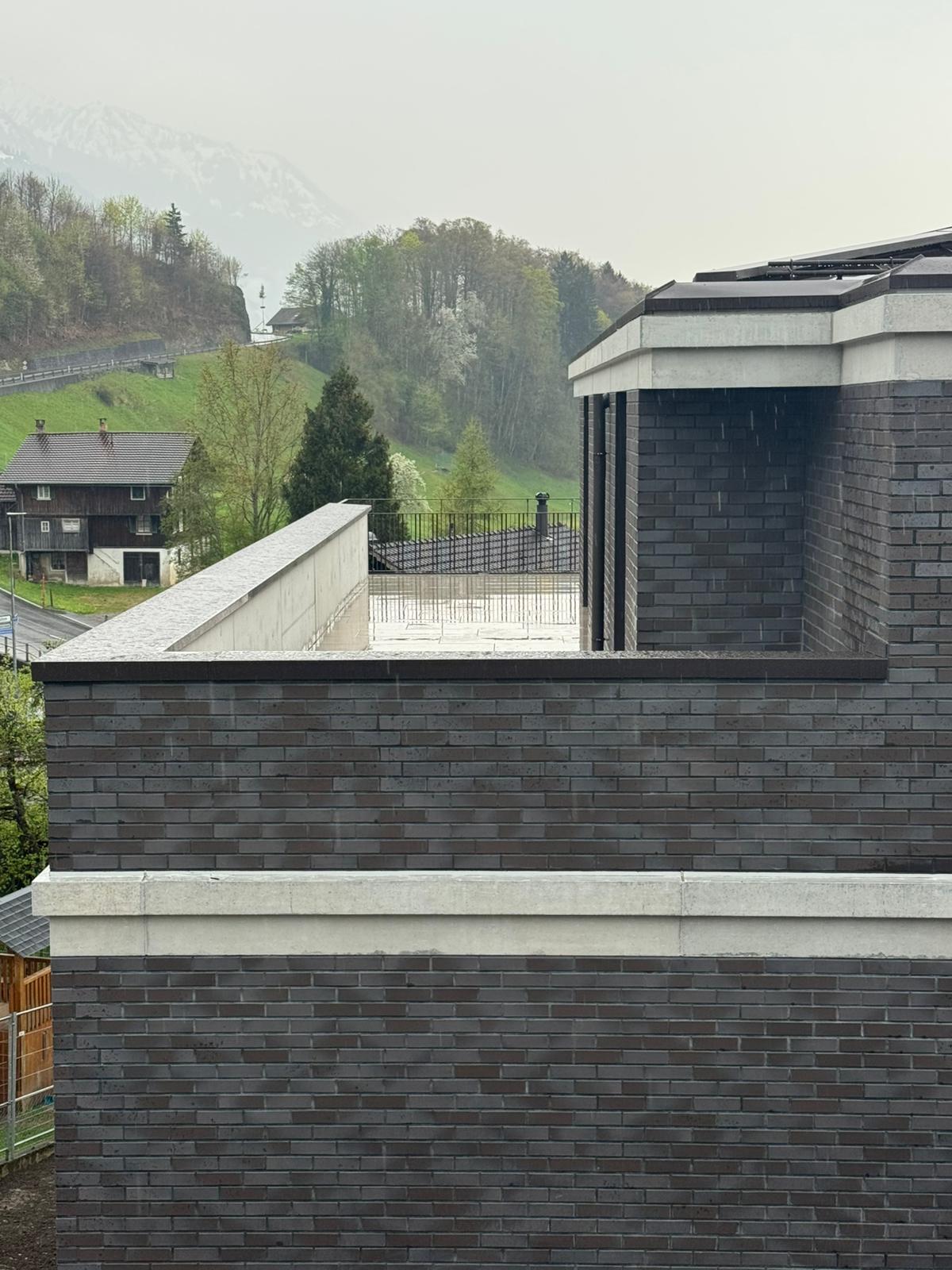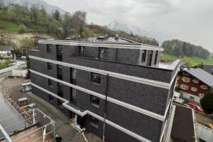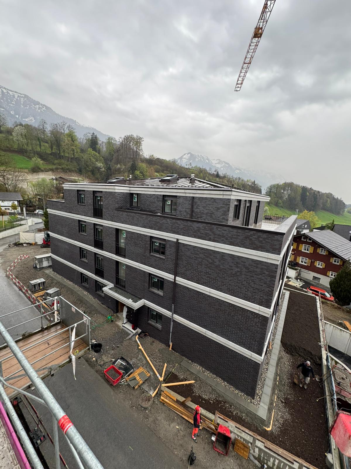 Das erste Haus ist nun vollständig ausgerüstet und präsentiert sich mit seiner hochwertigen Klinkerfassade bereits in seinem charakteristischen und modernen Erscheinungsbild. Auch im Inneren sind grosse Fortschritte erkennbar, der Innenausbau ist bereits weit fortgeschritten und lässt die zukünftigen Wohnräume erahnen.