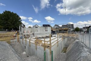 Die Rohbauarbeiten an der Bergstrasse in Auw schreiten planmässig voran. Die Strukturen der Wohnüberbauung werden zunehmend sichtbar und verleihen dem Projekt seine architektonische Form.