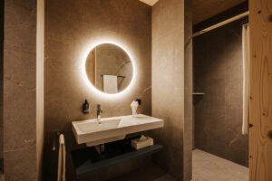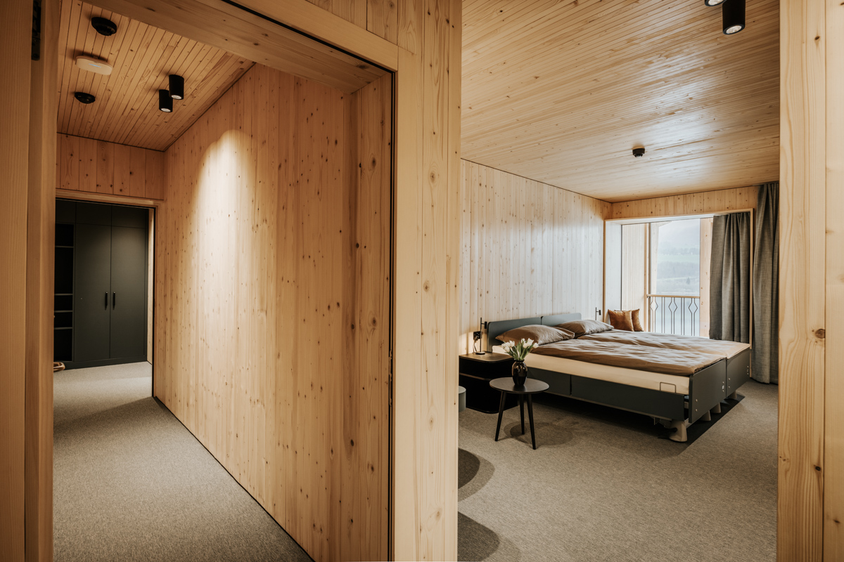 Holz aus dem Kanton Obwalden, unbehandelt und in seiner reinen Form verarbeitet, trifft auf Naturstein und sanfte Erdtöne. Diese Kombination schafft eine zeitlose, harmonische Stimmung, die gleichzeitig modern und tief verwurzelt wirkt. Jeder Raum erzählt von Ruhe, von Achtsamkeit und von der Verbundenheit zur Umgebung.