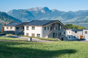 Leicht über dem Sarnersee gelegen, fügen sich die neuen Mehrfamilienhäuser harmonisch in das natürlich geneigte Gelände ein. Versetzt zueinander angeordnet, folgen sie dem Hangverlauf und öffnen den Blick über den See und die Obwaldner Berge.
